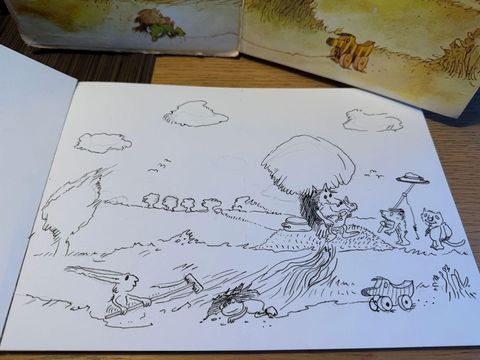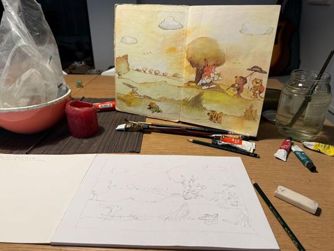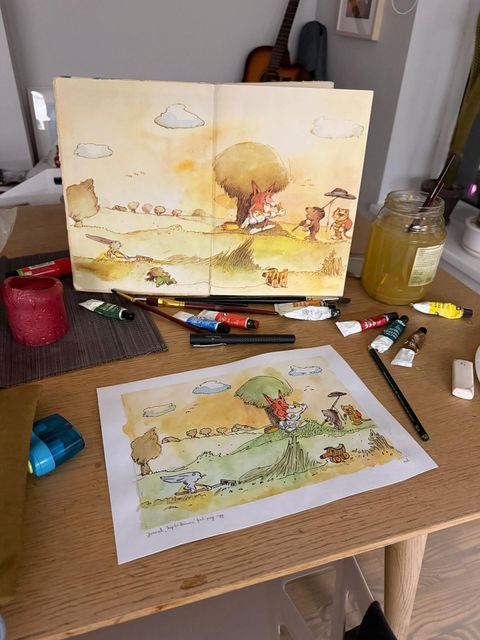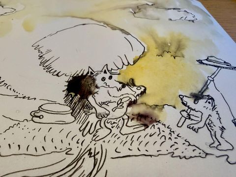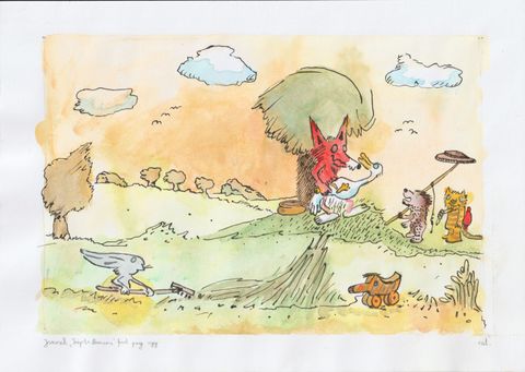 Yesterday I've continued learning the Naive illustration style of old childrens book, this time focusing on Janosch "The trip to Panama". For me, learning of a particular style is always best through copying, especially when a new media (watercolor + ink) is in play.